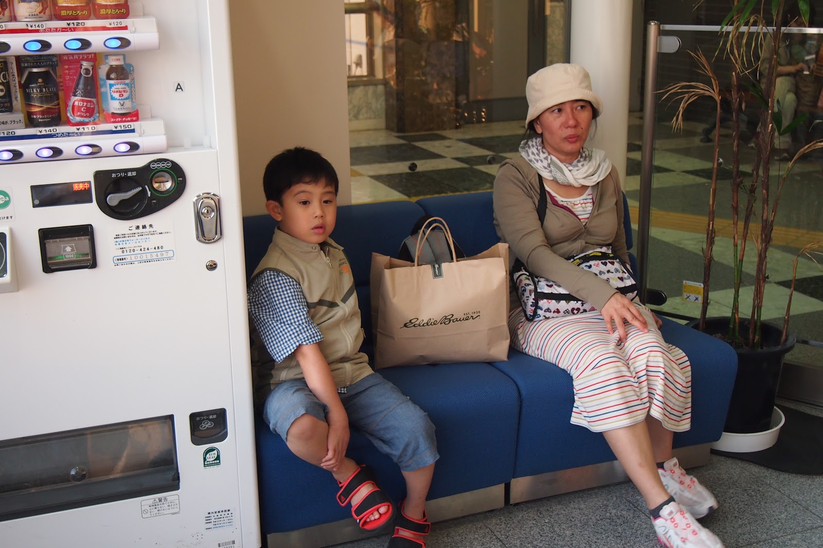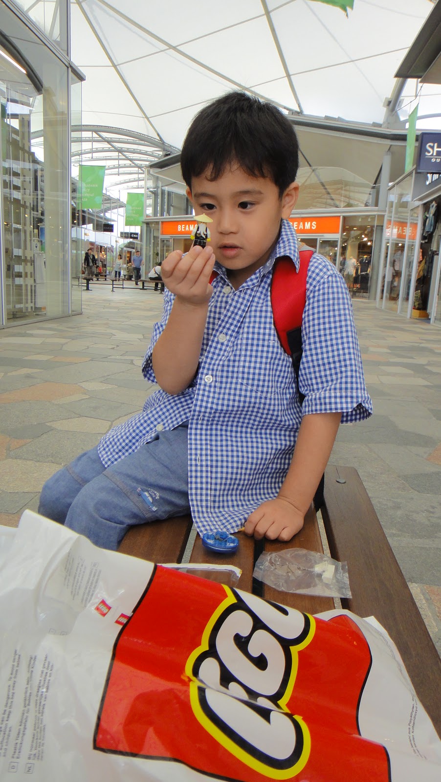 可是,小朋友還是不想逛了,只好找個避風的地方,爸爸媽媽輪流陪他玩剛買的玩具,再輪流去逛街。大概天氣太冷,媽媽晃了老半天,沒啥收獲。爸爸則是在Samsonite撿到非常便宜通通¥1050(含稅)的袋子,看了一下原價,哇!竟要兩三萬日幣!一折以下了耶!這也太誇張了吧!