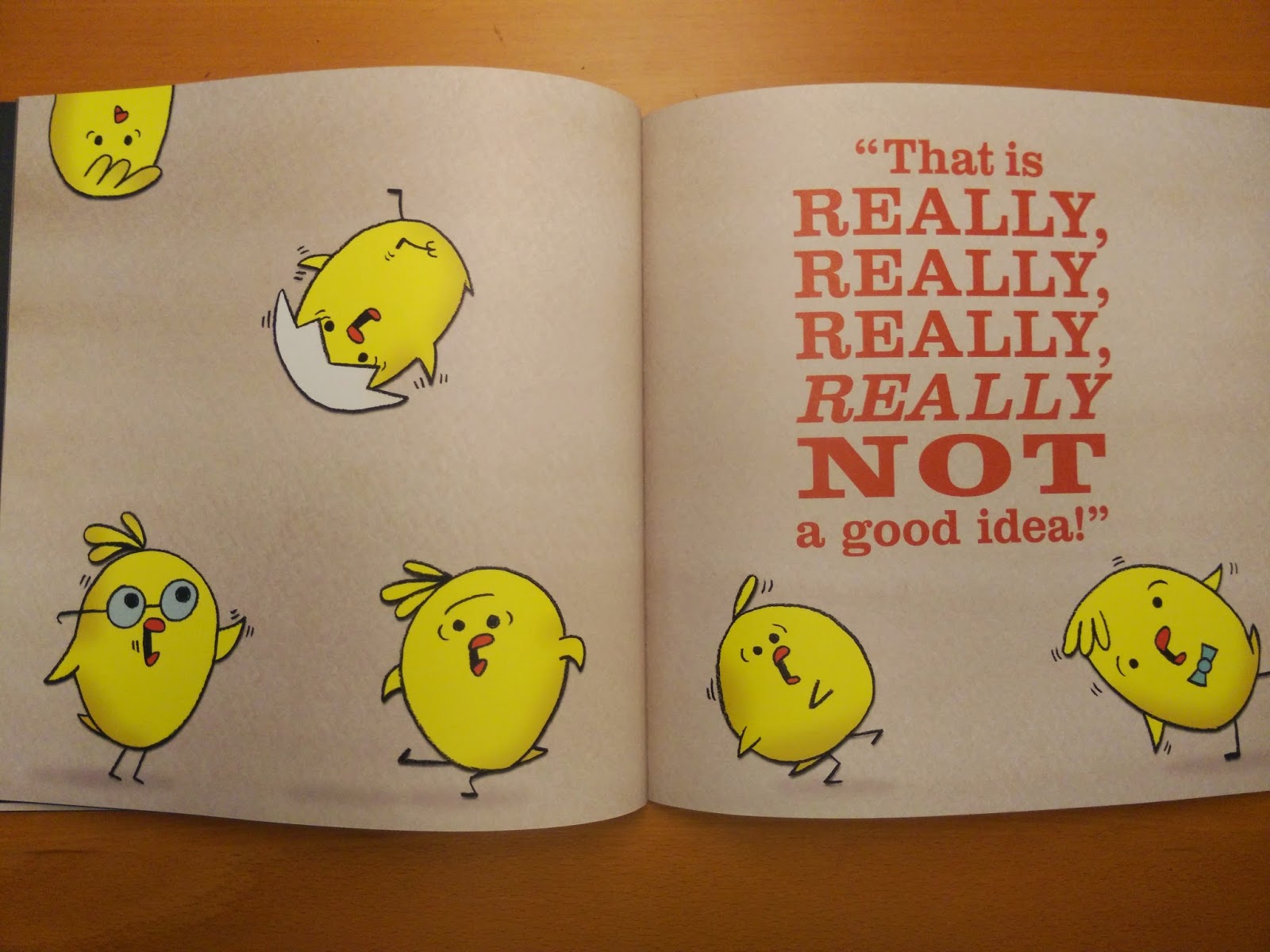 每次,當鵝媽媽同意狐狸的提議時,下一頁就會出現一堆小鵝寶寶,大喊「這不是個好主意」(That is not a good idea!)。然後,每次都再強調一下「這『真』的不是一個好主意」(That is really not a good idea!)。而且,圖中的小寶寶們,越來越緊張,越來越激動。讓人不禁也跟著提心吊膽,對於鵝媽媽即將會遭遇的悲慘命運,感到不安。