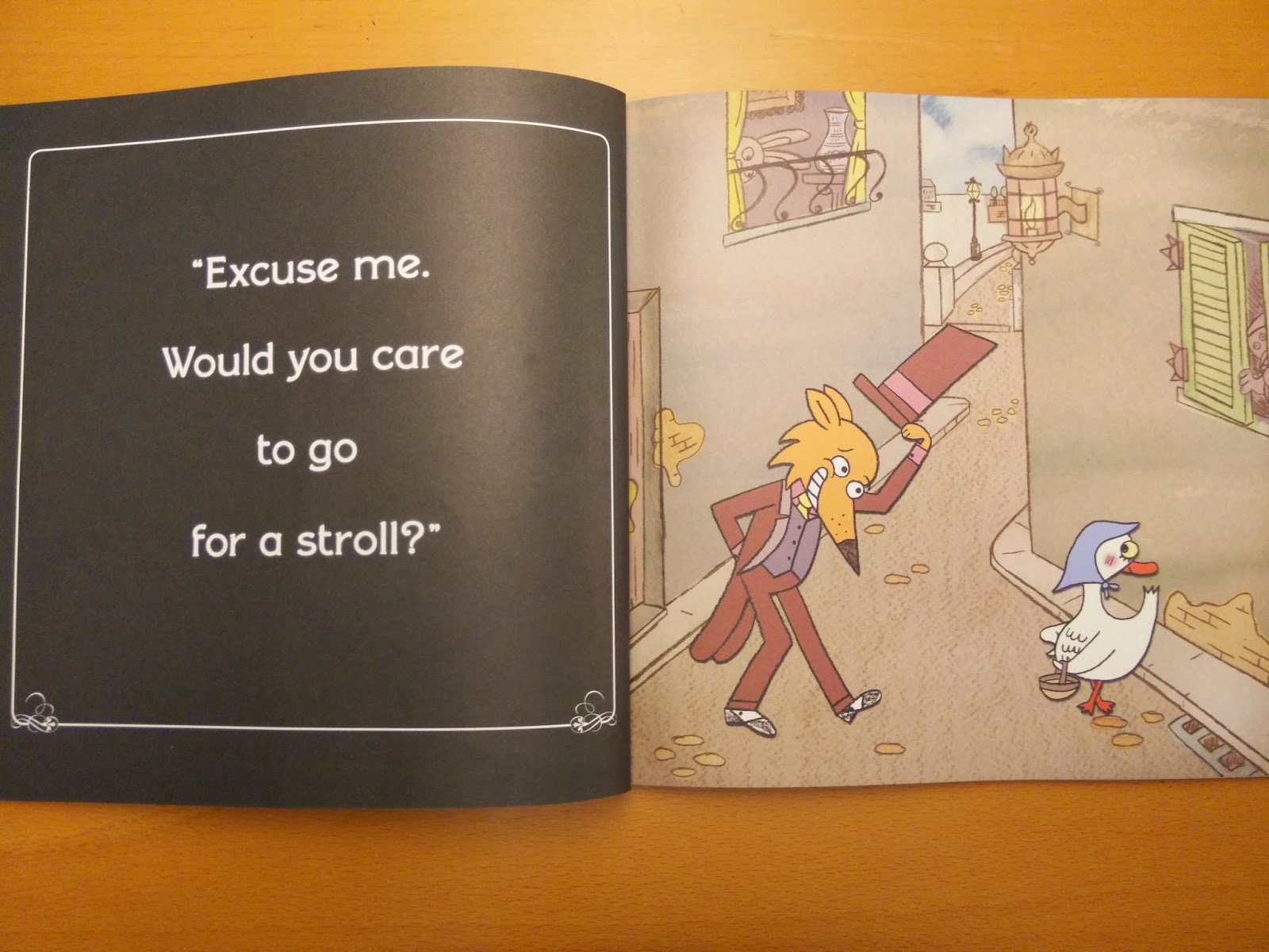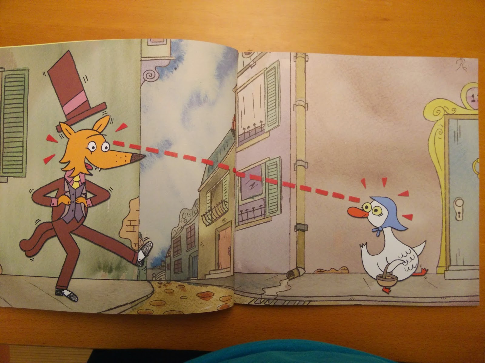故事是從狐狸在大街上碰到鵝媽媽開始。老實說,這隻鵝實在畫得像鴨子,要不是看到封底的介紹說明,要大家猜「goose」怎麼了,我真的一直認為是「duck」!好啦,回到故事。狐狸邀請鵝媽媽去散步,越走越遠,從大街上,到森林裡,然後來到狐狸的家。甚至還幫他燒水準備煮湯.........