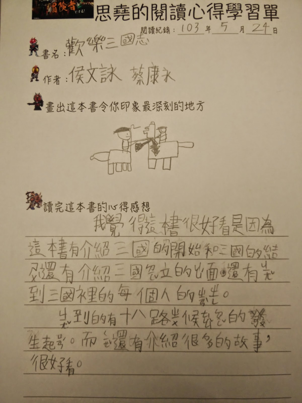 小傢伙後來也選了這本書寫讀書心得。可是啊!這聽得快爛掉的故事太長,他還真的不知道應該怎樣用簡短的文句來描述,真是難為他了!