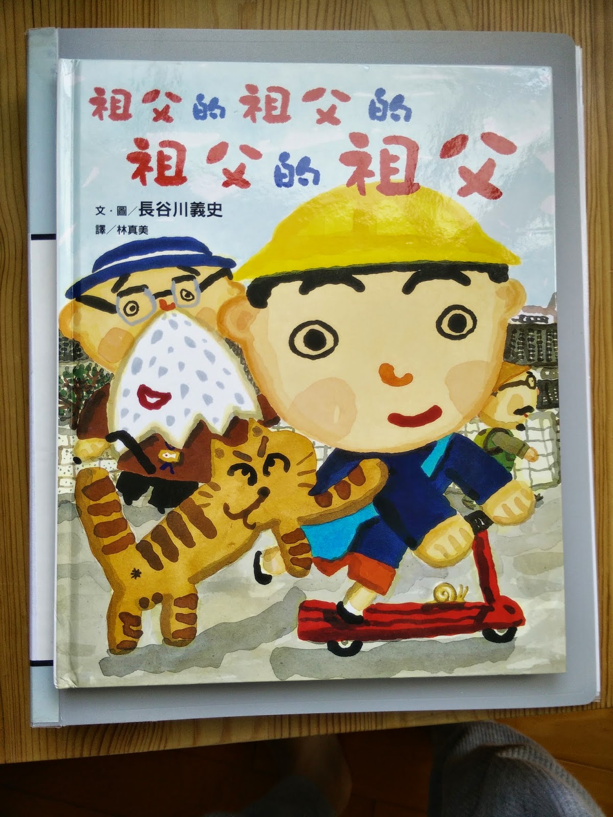 這本媽媽覺得無厘頭的繪本,就是他當時愛不釋手的作品。內容就是在介紹讓小朋友認識祖先。從自己開始,然後出場的是爸爸,祖父(爺爺),曾祖父,曾曾祖父,曾曾曾祖父, ...........一長串的「曾」,無止盡的加下去,配上圖片,顯示不同時代的日本歷史文化風貌。小朋友雖然不了解日本歷史,所以,對於畫中,一些時代場景,沒有像媽媽一樣有共鳴。可是,不斷增加「曾.....祖父」的文句,配上誇張的圖片,還是讓他看得樂開懷。